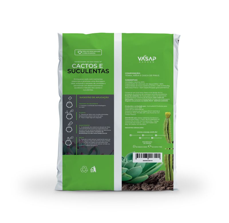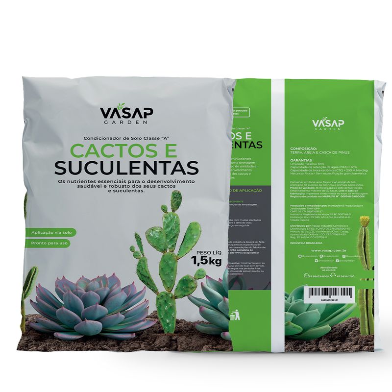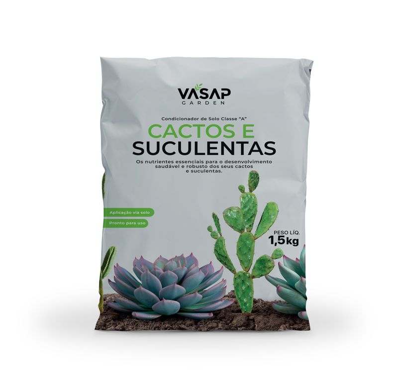 Ideal para fornecer, complementar e repor os nutrientes que os cactos e suculentas necessitam.DosagemVasos pequenos (até 10cm de diâmetro): 3 gramas por vasoVasos médios (de 10cm até 20cm de diâmetro): 6 gramas por vasoVasos grandes (acima de 20cm de diâmetro): 10 gramas por vaso.Dicas para o seu melhor cultivo:Adubar próximo a borda do vaso e longe do caule da plantaApós adubar, regar bemAs aplicações devem ser realizadas preferencialmente no final da tarde ou pela manhã, bem cedoAdubar a cada 20 diasNão adubar plantas doentes, fracas ou recém transplantadas.Composição: Terra e casca de pinus