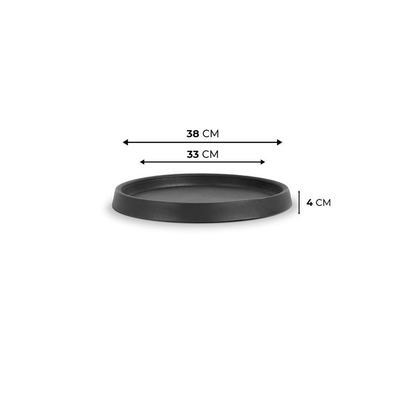 Prato GG: Dimensões: 33 cm de boca X 38 cm de comprimento. Esse prato é compatível com os vasos: Cone liso 77 Cone riscato 77 Vietnamita 98 Thai 110 Material: polietileno (plástico) 100% reciclado. Os pratos possuem Proteção UV.*