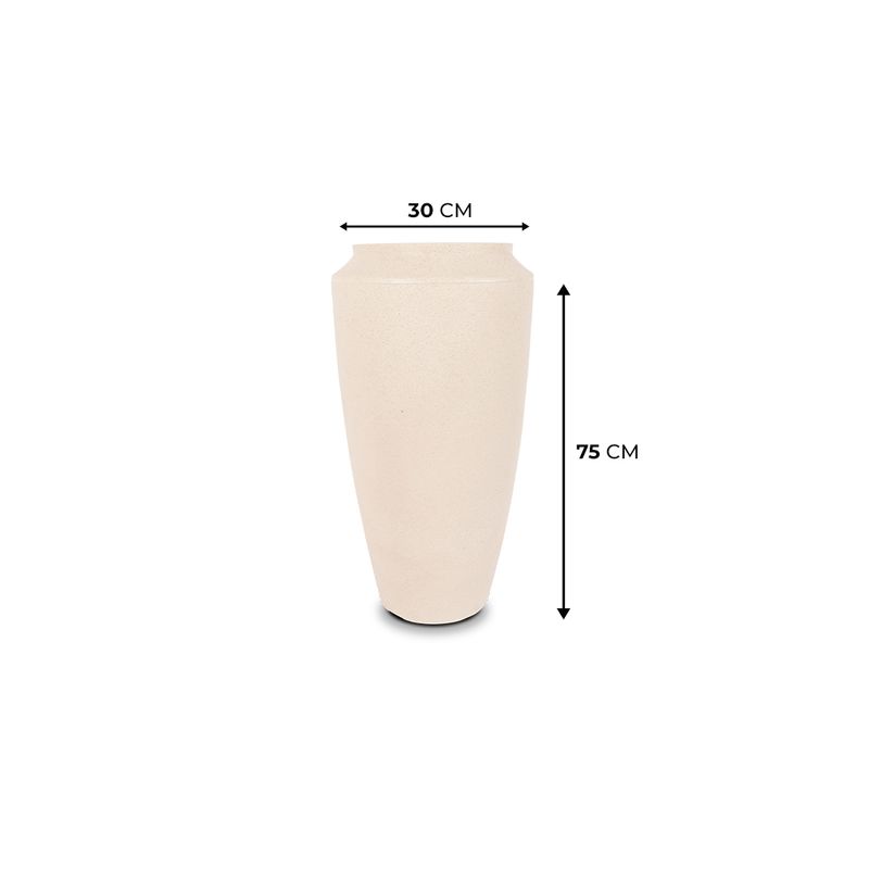 Vaso para plantas thai 75:Dimensões: 75cm de altura, 23cm de base, 26cm de boca e 30cm de diâmetro.Litragem: 62.7L.Não possui furo.O prato M é o ideal.Material: polietileno (plástico) 100% reciclado.Os vasos possuem Proteção UV.As cores podem sofrer variação de tom devido a matéria-prima ser polietileno 100% reciclado.A cor branco mármore tem o tom mais bege, pode sofrer variação de cor nas fotos.